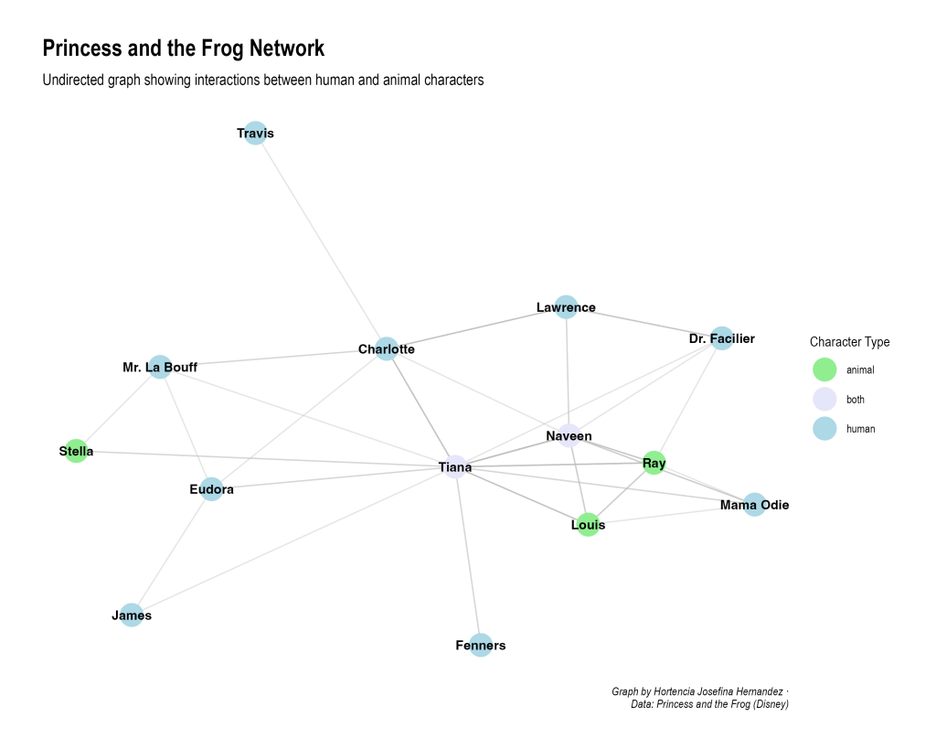 First off, Princess and the Frog? Probably one of my favorite Disney princess movies, the soundtrack is SO GOOD, and the movie in Spanish?! even better!! love! Anyways, the network has each character categorized as type: animal, both, or human. Tiana and Naveen, since they become frogs in the movie, are classified as both. The nodes are the colored circles representing each character–Tiana, Louis, Ray, and Naveen (just to name a few) are considered nodes. Where the lines that are connecting them to each other is an edge–notice there is one edge or one line between Tiana and Fenners. Usually we go into detailing that the thicker the line, edge, is the stronger the connection. In this case, each edge represents the number of scenes that they talk to each other. I could have looked at the number of lines that each character says to one another, but I focused on counting the first instance in a scene where the characters actually spoke. Let’s assume, we have NEVER seen Princess and the Frog (if you haven’t you need to) looking at the network, it would be easy to tell that the main characters are Tiana and Naveen. This can be determined based on the edge count, in graph theory, this is referred to as the degree of a node. For now, that is where I am going to leave that. Maybe I will make a crash course on networks and graph theory, but let’s hold off on that for today!