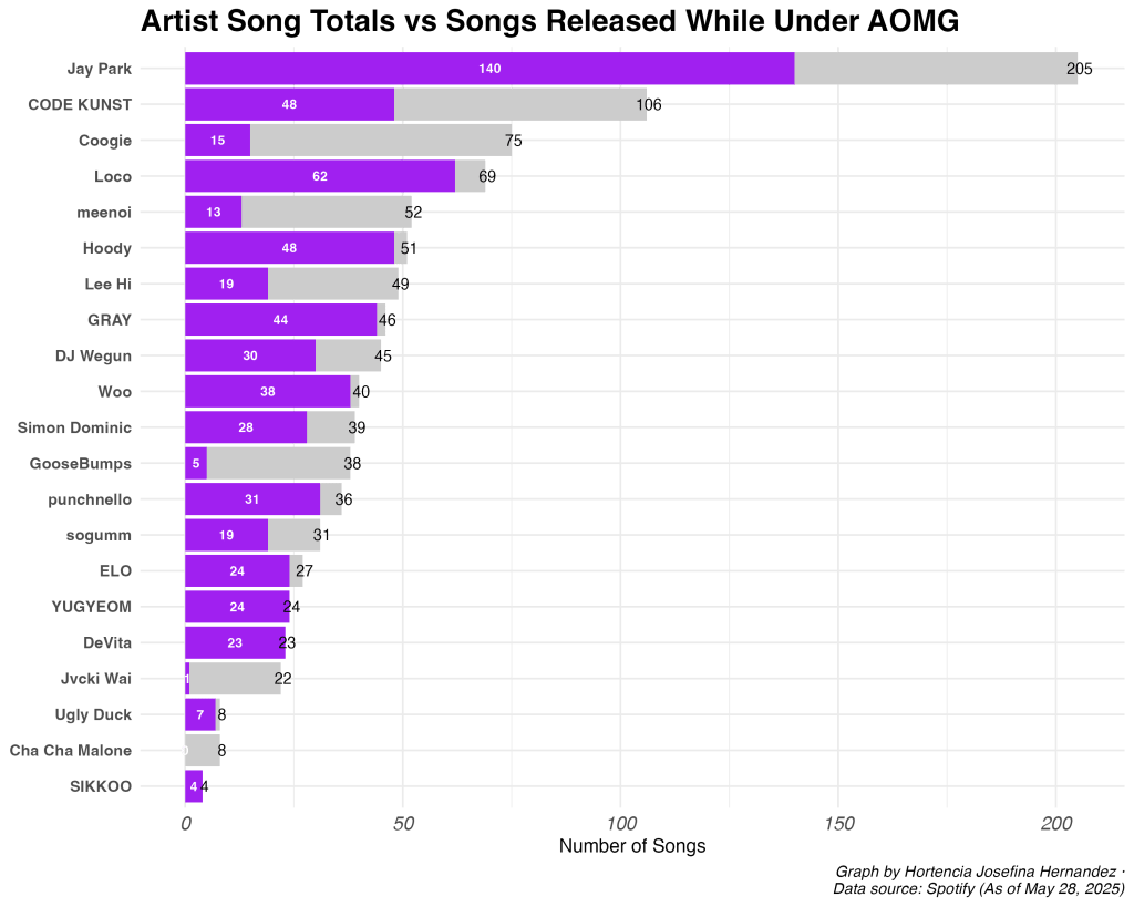 Notice that Jay Park has the most songs released, and that makes sense, he has been active (in the music industry) but he was the founder of AOMG. SIKKOO is the newest addition to AOMG, in fact they recently signed under AOMG on April 7, 2025. Lastly, DJ Pumkin has no songs where he is listed at least according to Spotify. He is featured on tracks though.