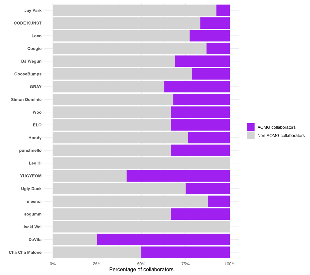 Note: The table only includes artists who were previously or are currently part of AOMG. For each collaboration, only the first unique artist affiliated with AOMG (past or present) is represented. This means the table reflects the distinct AOMG artists they have collaborated with, not every possible repeat occurrence.