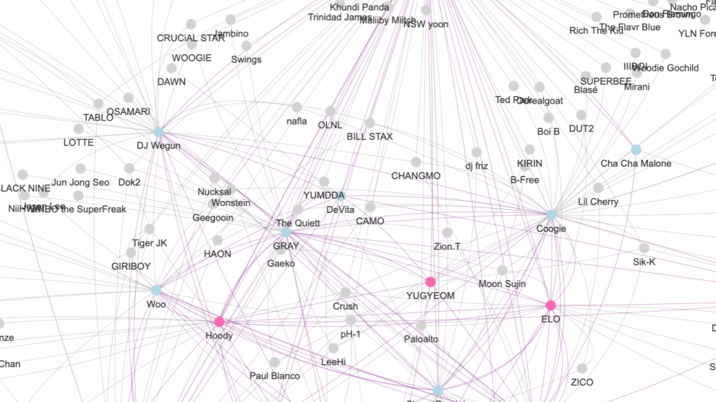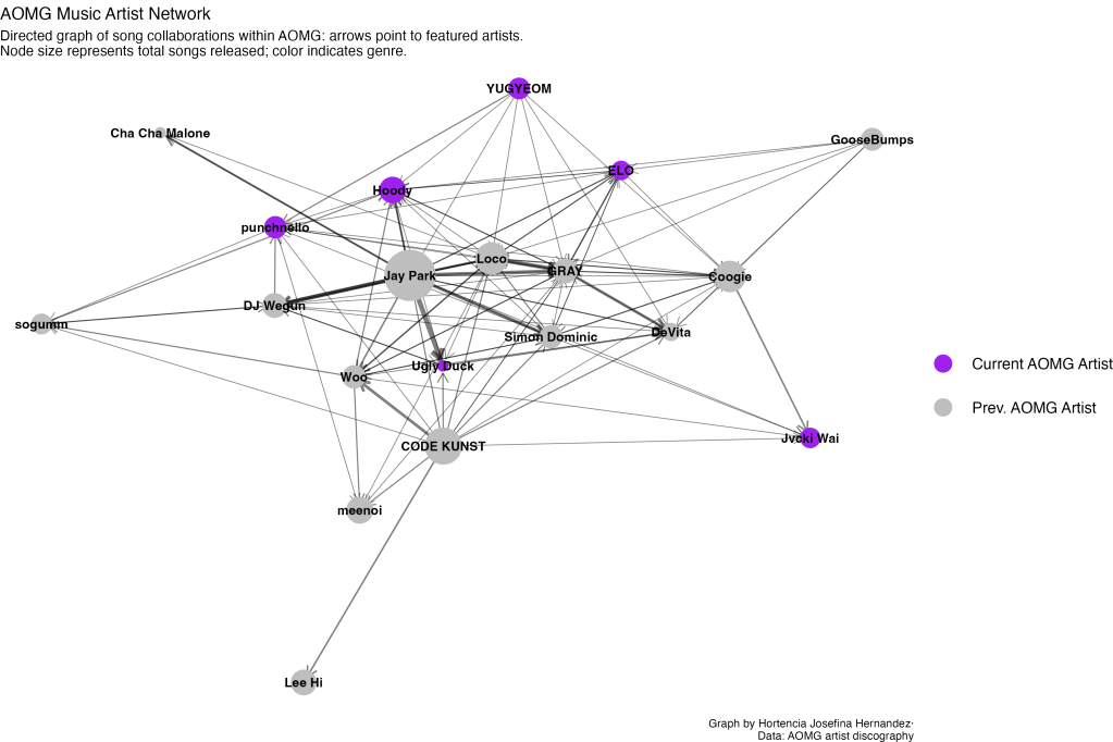 Similar to the Seventeen Network, the network was built in R and published through GitHub. As a quick reminder, it only displays musical collaborations available on Spotify, with current and previous AOMG artists listed first.