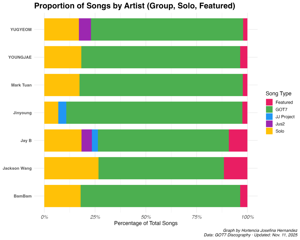As solos and as a group, GOT7 has many songs under them. Table 1 summarizes the number of songs where each member is the first artist and songs they were featured on.